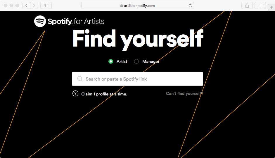 まず、アプリでSpotifyアカウントにログインするか、パソコンでこの ページを 開きます。あなたがアーティストまたはマネージャーであるかどうかを選択し、指示に従ってください。