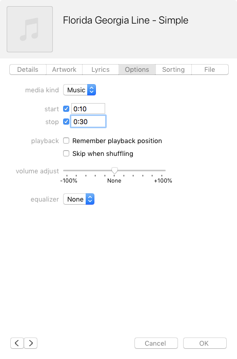 現在、Mac版では楽曲セグメントの変換に対応していません。変換後、DRMフリーの楽曲をiTunesで再生し、「曲情報」→「オプション」をクリックして開始/終了時間を設定してください。