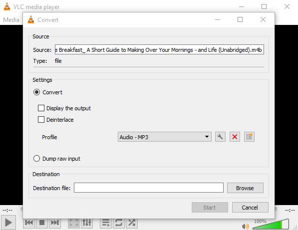 VLCメディアプレーヤーを起動して、[メディア]をクリックして、[変換/保存]をクリックします(または、Ctrl+Rを使用して)、変換したいm4bファイルを選択して[追加]をクリックして、[変換/保存]をクリックします。ポップアップされたウィンドウで「