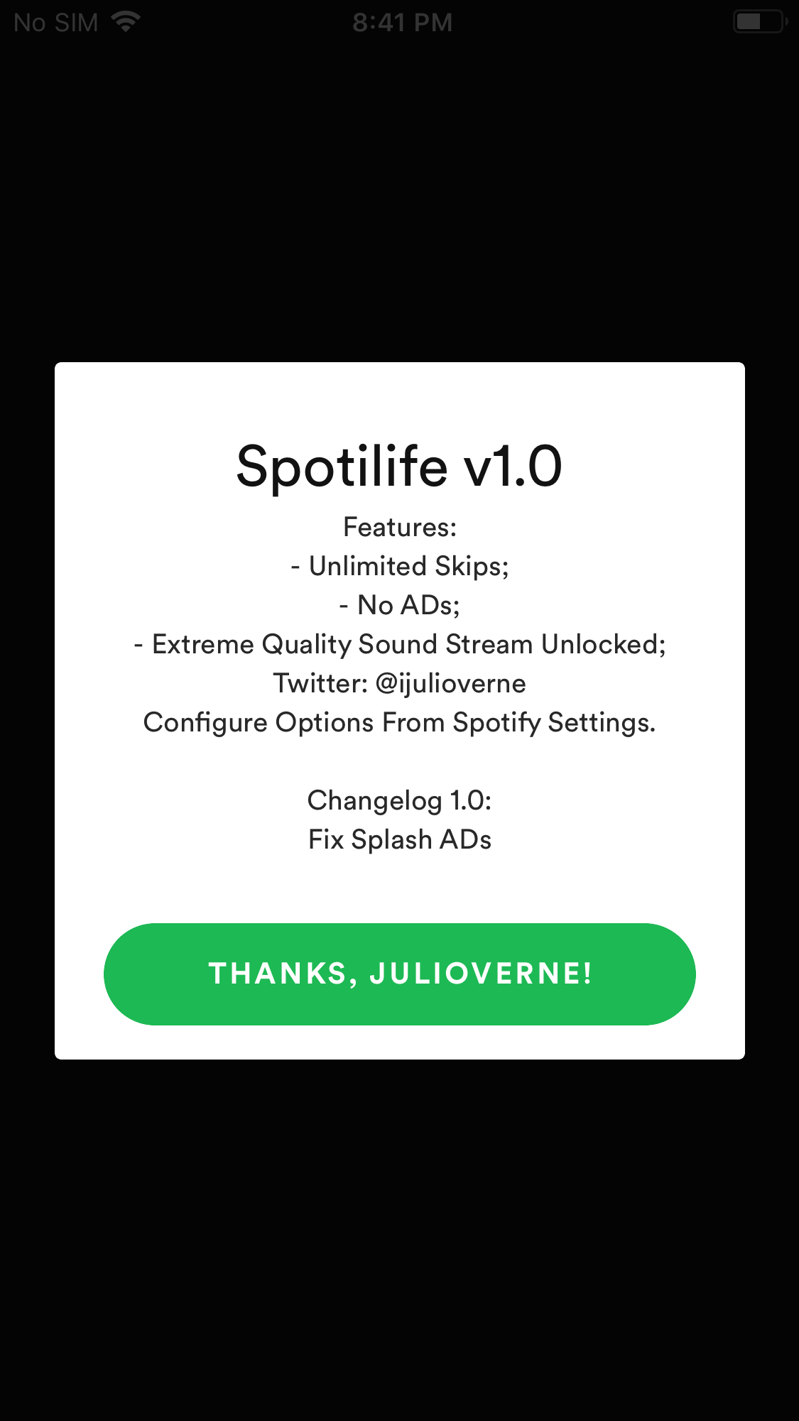 Spotify++を再度起動し、緑色の「ありがとう」ボタンをタップします。