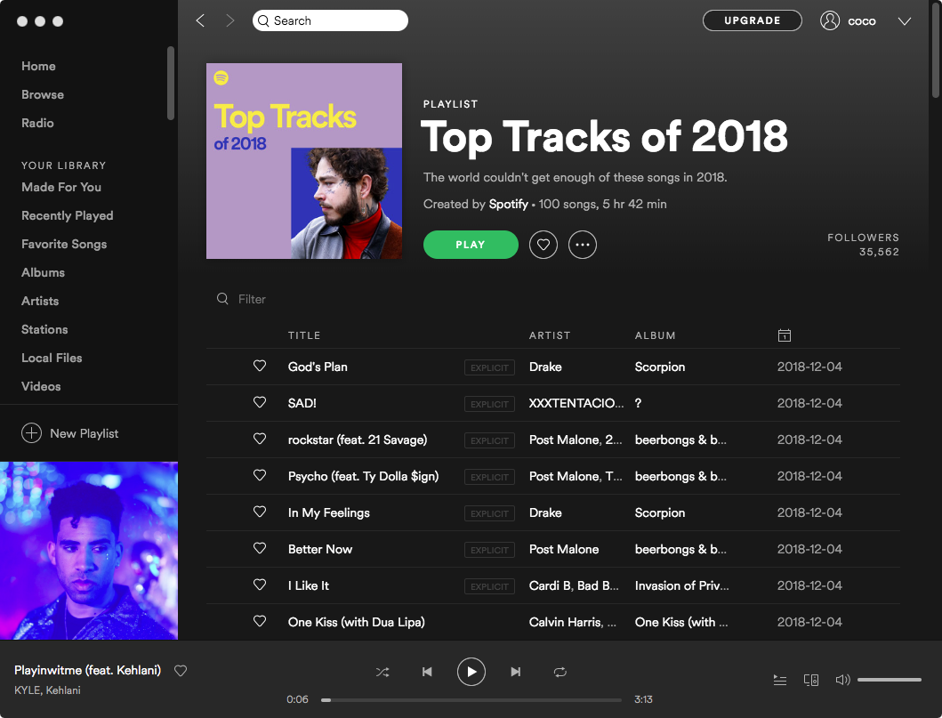 2018年の終わりに向けて、多くのサイトや音楽サービスが2018年のトップソングチャートを発表しました。Spotifyではここに「Top Tracks of 2018」というプレイリストがあり、ドレイクの「God's Plan」、「In My Feelings」、「Nice For What」、デュア・リパの「IDGAF」など、2018年に最も人気のある100曲が収録されています。何を聴いていいかわからないという方は、このプレイリストを手に入れるだけでお気に入りが見つかるかもしれません。Spotifyは誰でも無料で、お使いの携帯電話やタブレット、パソコン、テレビなどでプレイリストを楽しむことができます。無料のユーザーは、インターネット接続がある場合にのみ曲をストリーミングすることができますが、月額9.99ドルを支払うSpotifyプレミアムユーザーは、オフラインで聴くためのプレイリストをダウンロードすることができます。